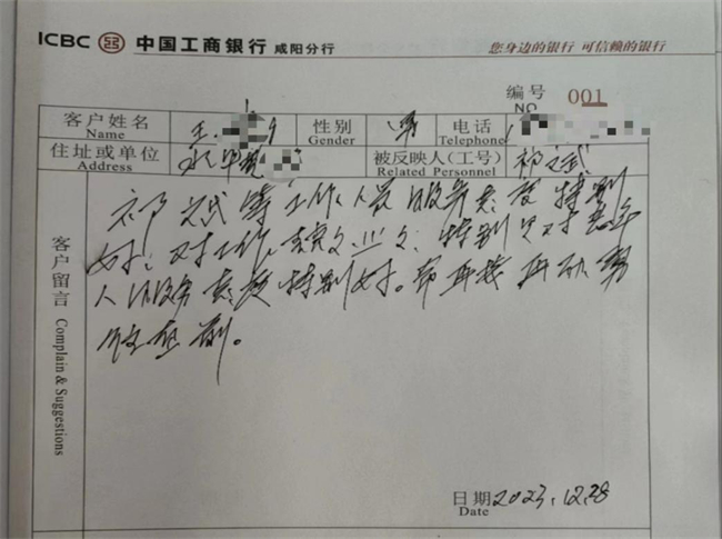 12月28日,家住三原县城关镇86岁高龄的王先生在工行咸阳三原盐店支行客户留言簿上,写下这样一段感人的话“祁斌等工作人员服务态度特别好,对工作兢兢业业,特别是对老年人的服务态度特别好,希再接再厉”。