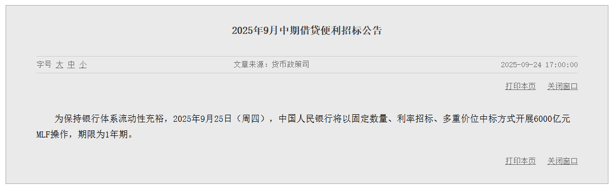 据央行网站24日消息,为保持银行体系流动性充裕,2025年9月25日(周四),中国人民银行将以固定数量、利率招标、多重价位中标方式开展6000亿元MLF操作,期限为1年期。