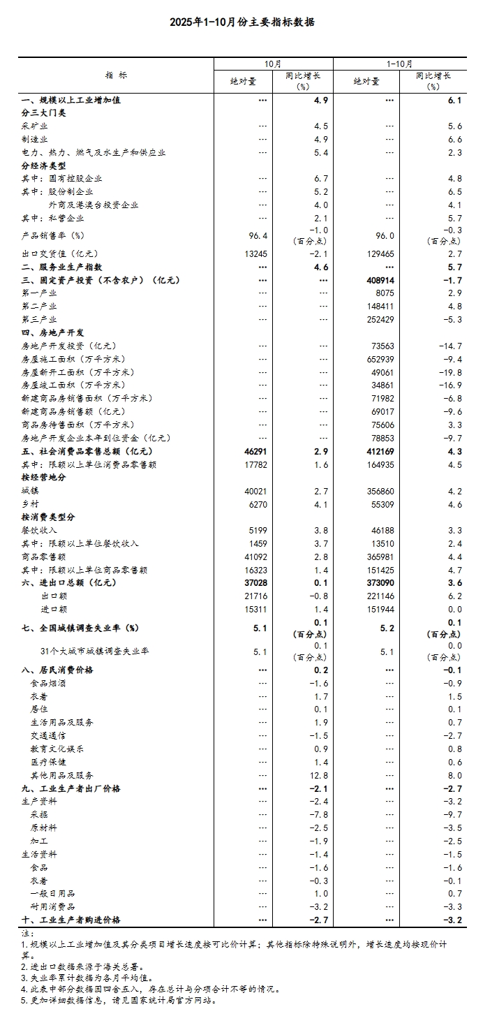 总的来看,10月份国民经济运行总体平稳,转型升级扎实推进,发展新动能继续壮大。也要看到,外部环境不稳定不确定因素较多,国内结构调整压力较大,经济平稳运行面临不少挑战。下阶段,要坚持以习近平新时代中国特色社会主义思想为指导,深入贯彻落实党的二十届四中全会精神,坚持稳中求进工作总基调,全方位扩大国内需求,着力稳就业、稳企业、稳市场、稳预期,积极推动宏观政策持续落地增效,全面深化改革开放,进一步强化创新驱动,促进经济质的有效提升和量的合理增长。