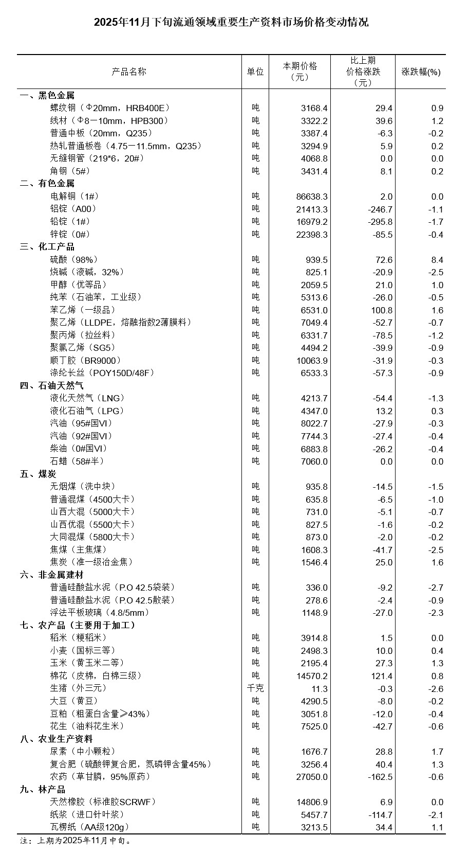 据国家统计局网站消息,国家统计局12月4日发布2025年11月下旬流通领域重要生产资料市场价格变动情况。据对全国流通领域9大类50种重要生产资料市场价格的监测显示,2025年11月下旬与11月中旬相比,15种产品价格上涨,30种下降,5种持平。