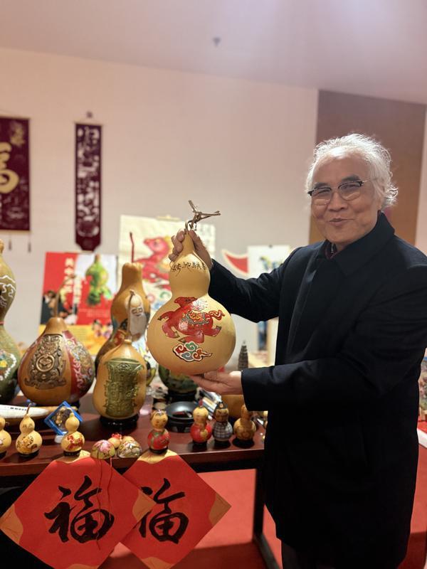 西安非遗代表性传承人梁平安展示自己的葫芦作品