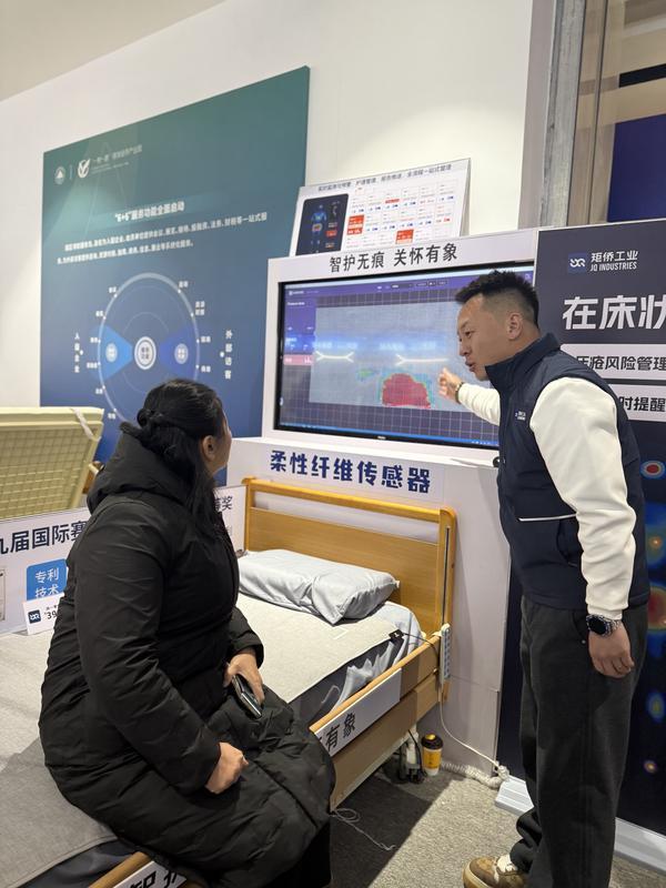 适老化产品体验区人头攒动。来自北京的一家企业带来的智能监测床垫前围满了体验者,工作人员现场演示:“这张床垫有‘三防一拍’功能,能实时监测睡眠质量,还能防跌倒、防压疮、防中风。如遇紧急情况,老人只需拍打床垫就能触发SOS紧急呼救。”从事养老服务行业的体验者朱艳试用后说:“今天逛集,主要想了解智能产品。这样的智能产品能解决养老服务中的痛点,让我们护理工作更高效、更安心。”