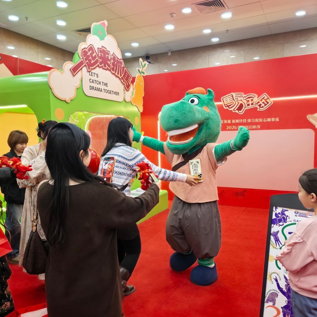 甘肃省博物馆内的“抓马”市集里,年轻游客排队争相与“绿马”人偶合影留念。新华社记者 李杰 摄