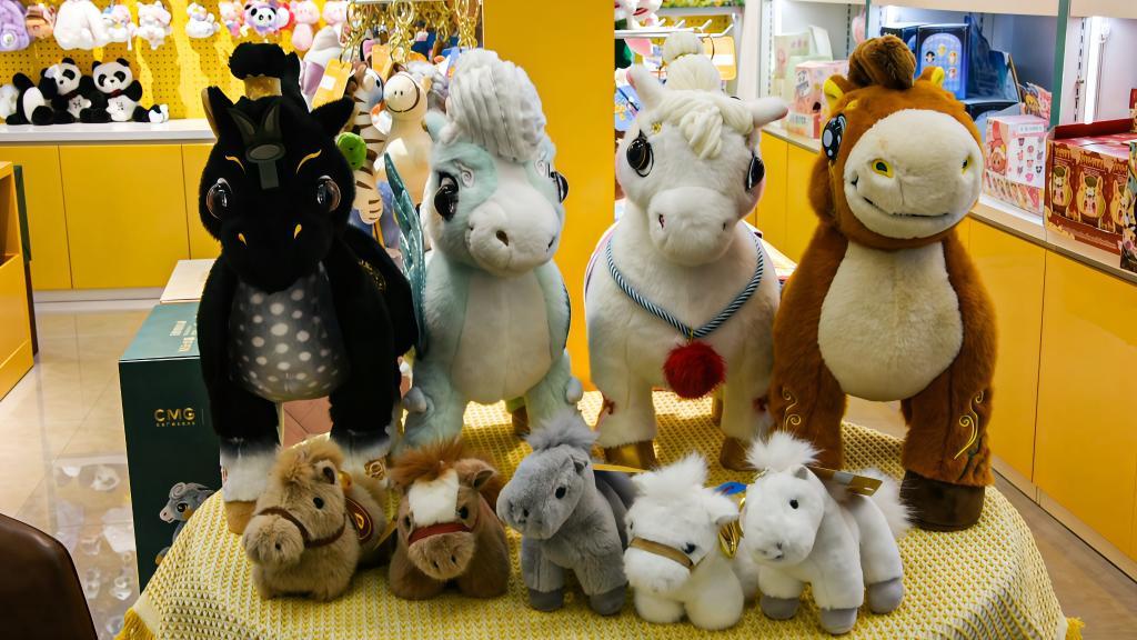 浙江义乌国际商贸城六区的“萌玩汇”店铺内,各种以“马”为造型的公仔几乎占据半壁江山。其中双手抱胸、表情傲娇的“傲娇马”公仔,枣红色、身上印着金色“发”字和铜钱图案的“马上有钱”公仔颇受欢迎。