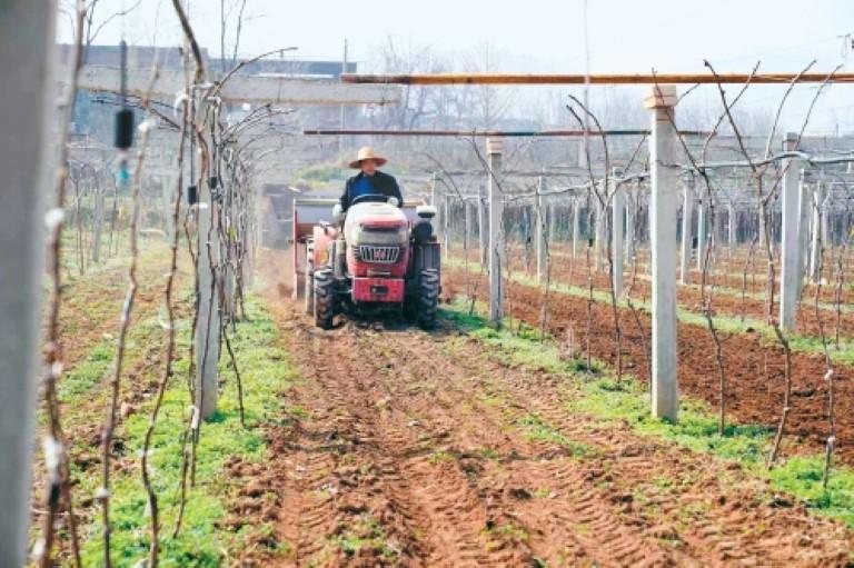 这边蓝莓大棚管护正忙,不远处的猕猴桃种植园里,种植户杜东宏驾驶着果园专用开沟施肥机,在果园里来回穿梭,一次性完成开沟、施肥、覆土全流程作业,肥效直达根系,为猕猴桃萌芽积蓄充足养分。