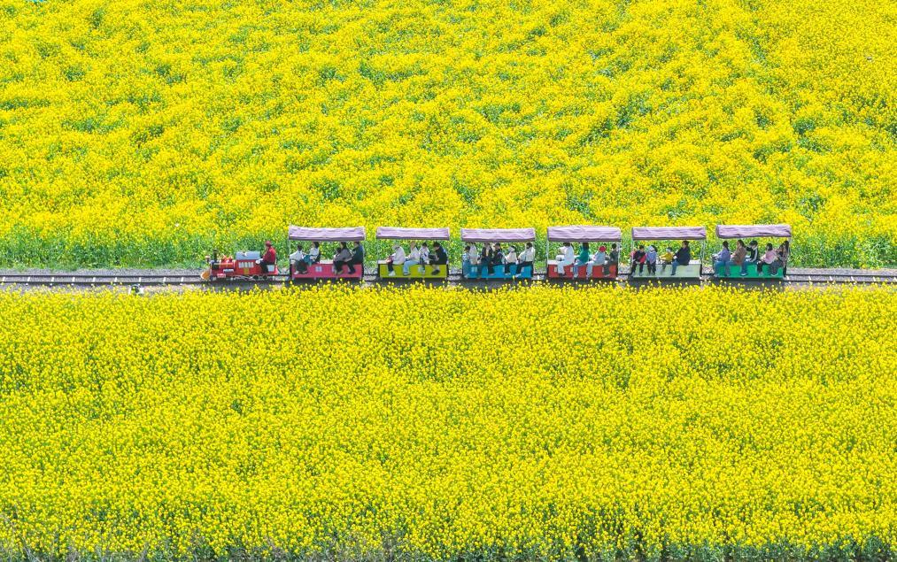 4月4日,游客在江苏省淮安市盱眙县黄花塘镇向阳花海乘坐小火车游玩(无人机照片)。新华社发(许昌银摄)